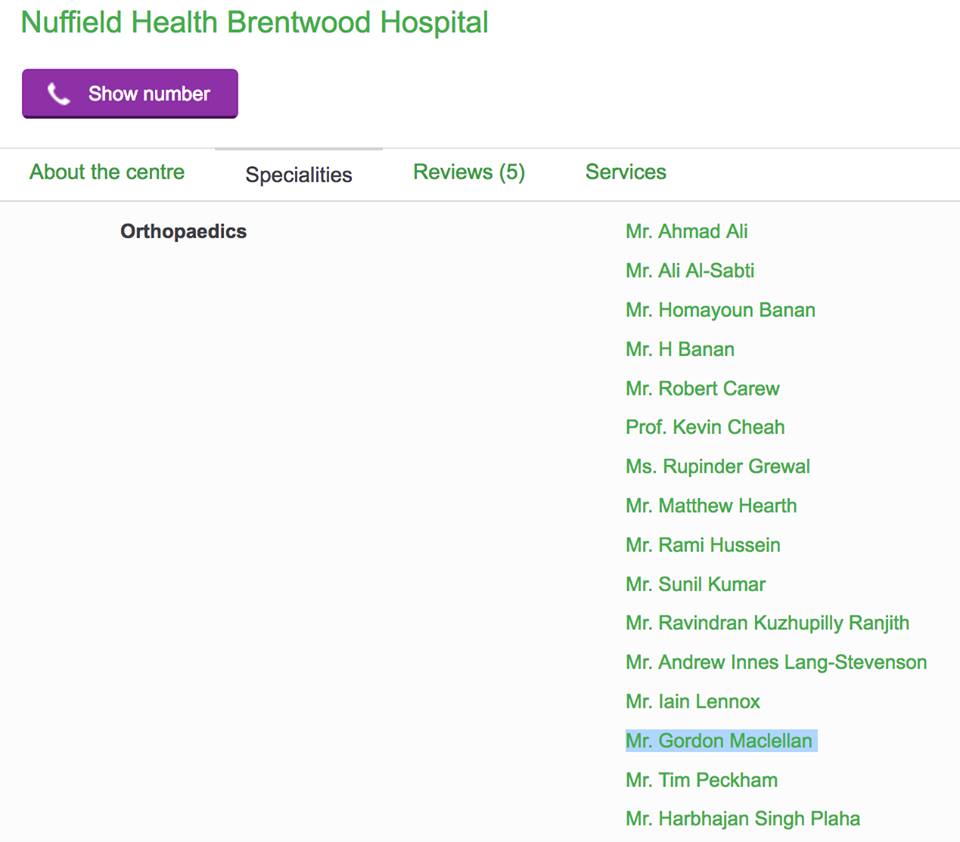 Dr Gordon MacLellan worked as a Private Orthopaedic consultant for the Nuffield Health Brentwood Hospital for 33 years.
